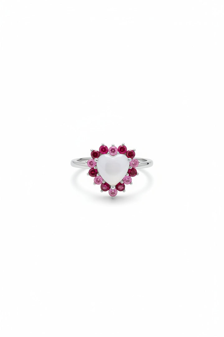 Anello con pietra di latte materno a forma di cuore e giro di rubini birmani e rosa