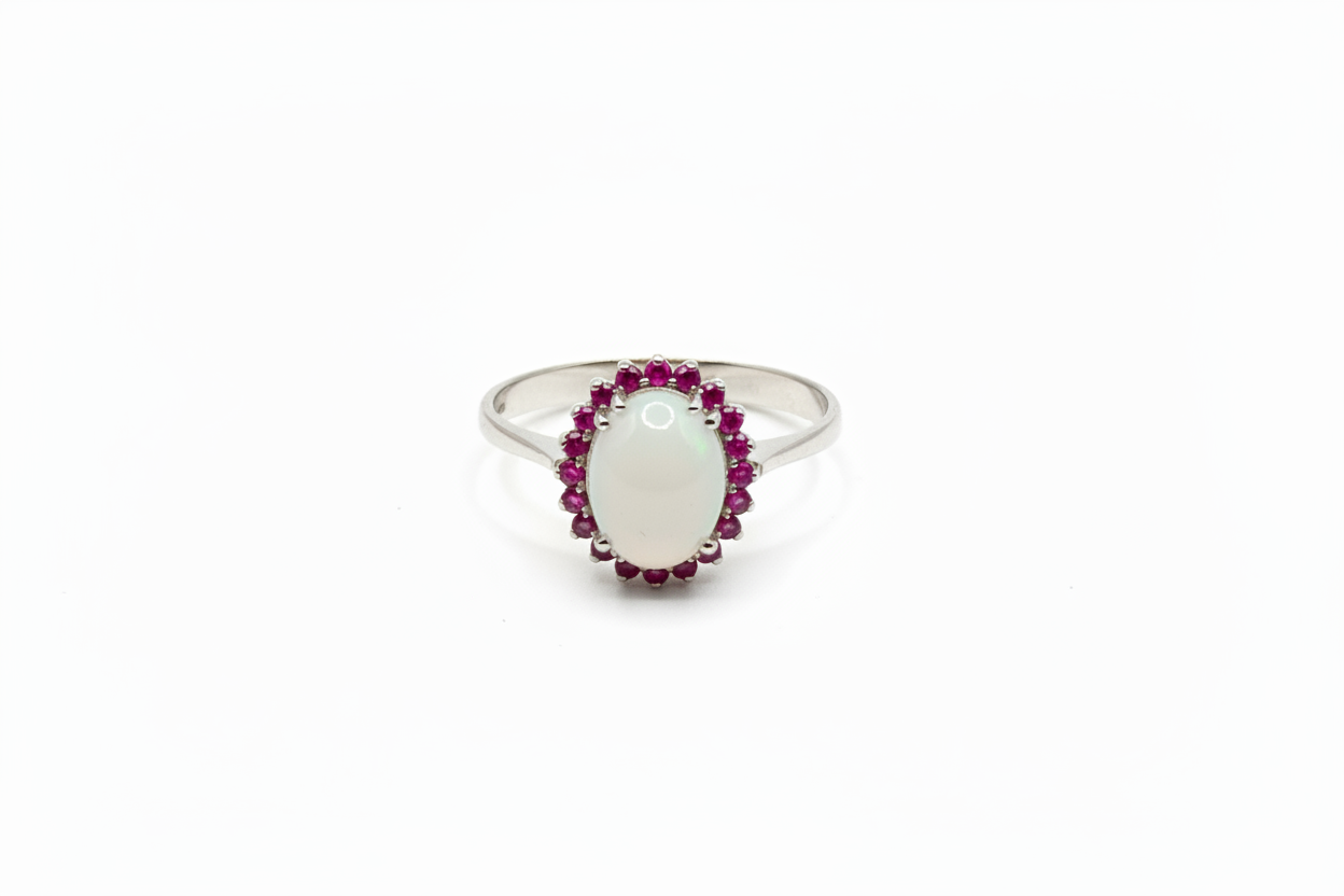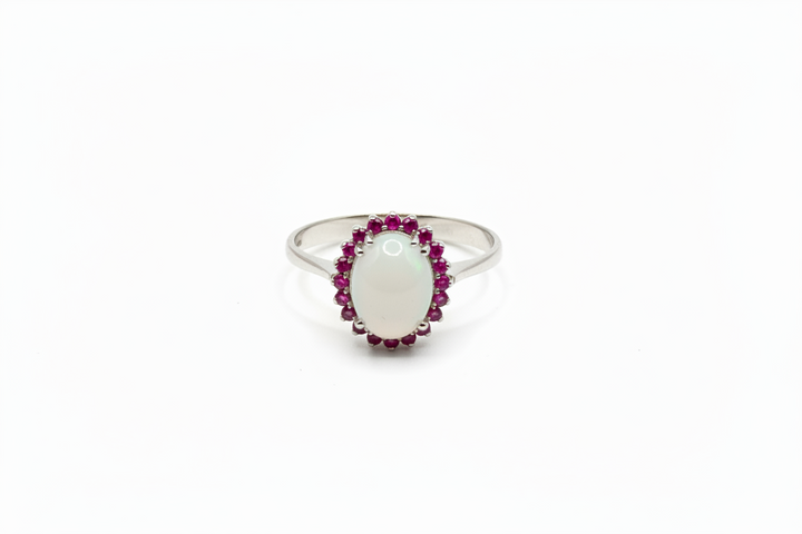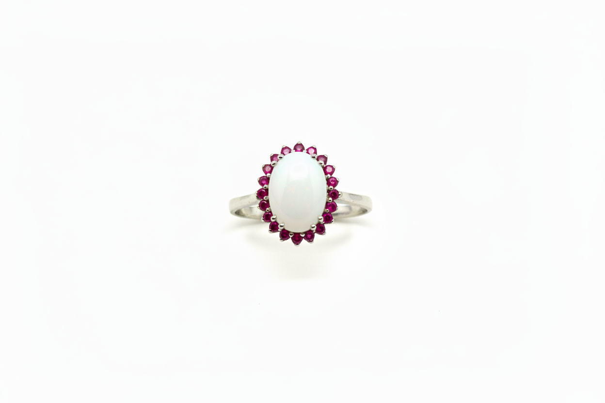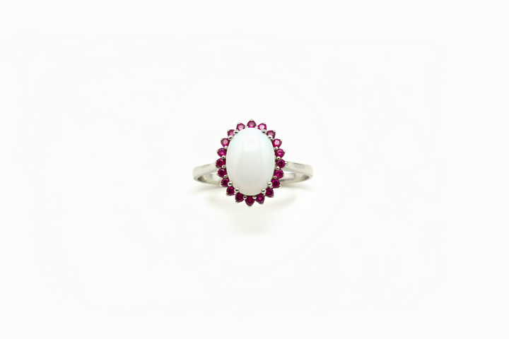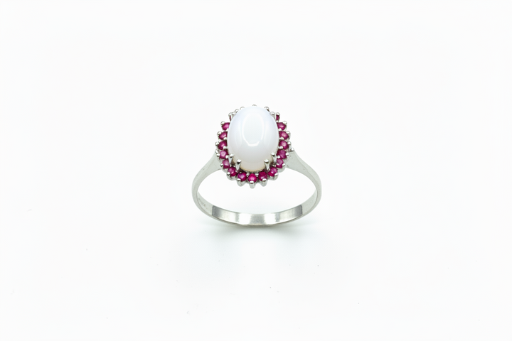 Anello con Pietra di Latte Materno a forma Ovale e Giro di Rubini in Oro Bianco 18 Carati