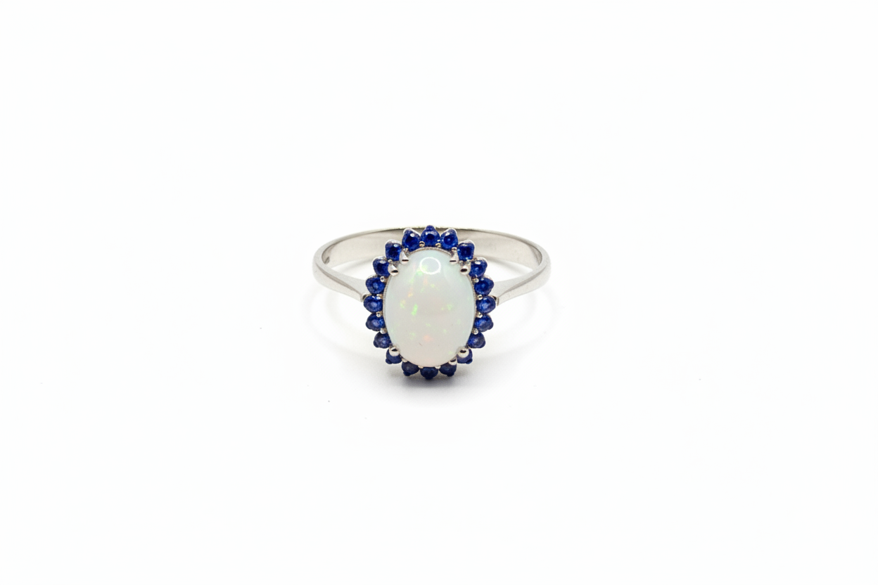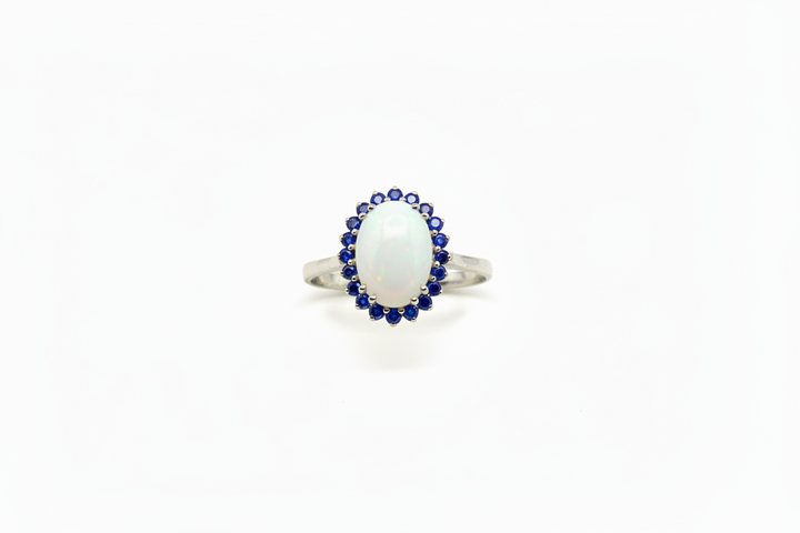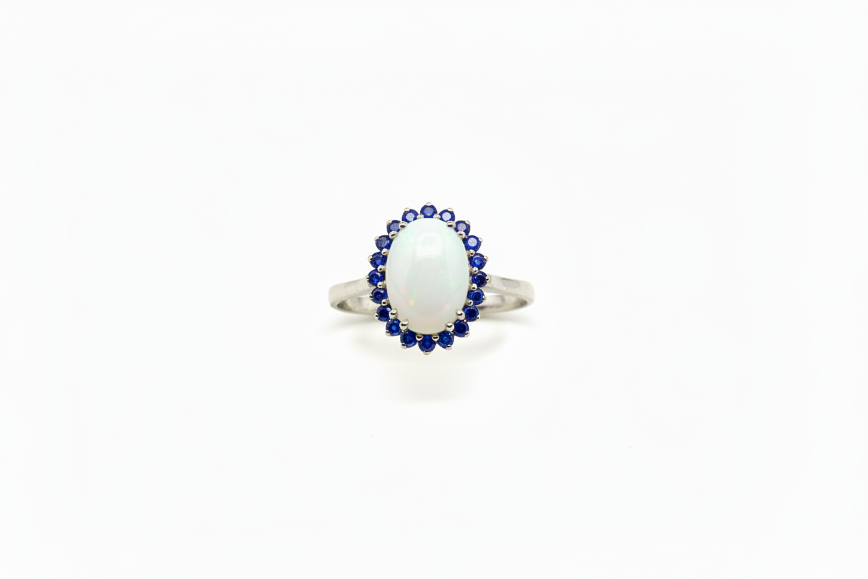 Anello con Pietra di Latte Materno a forma Ovale e Giro di Zaffiri in Oro Bianco 18 Carati