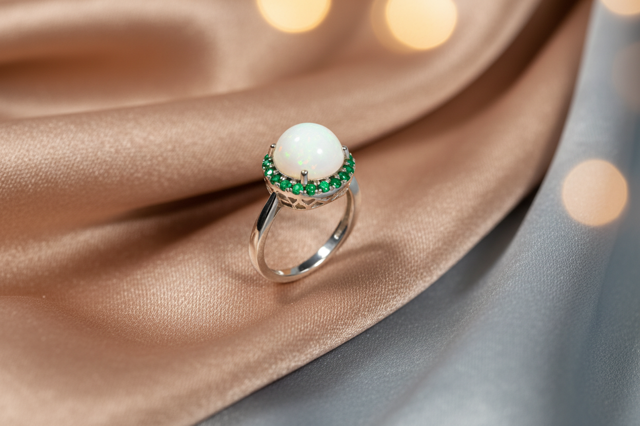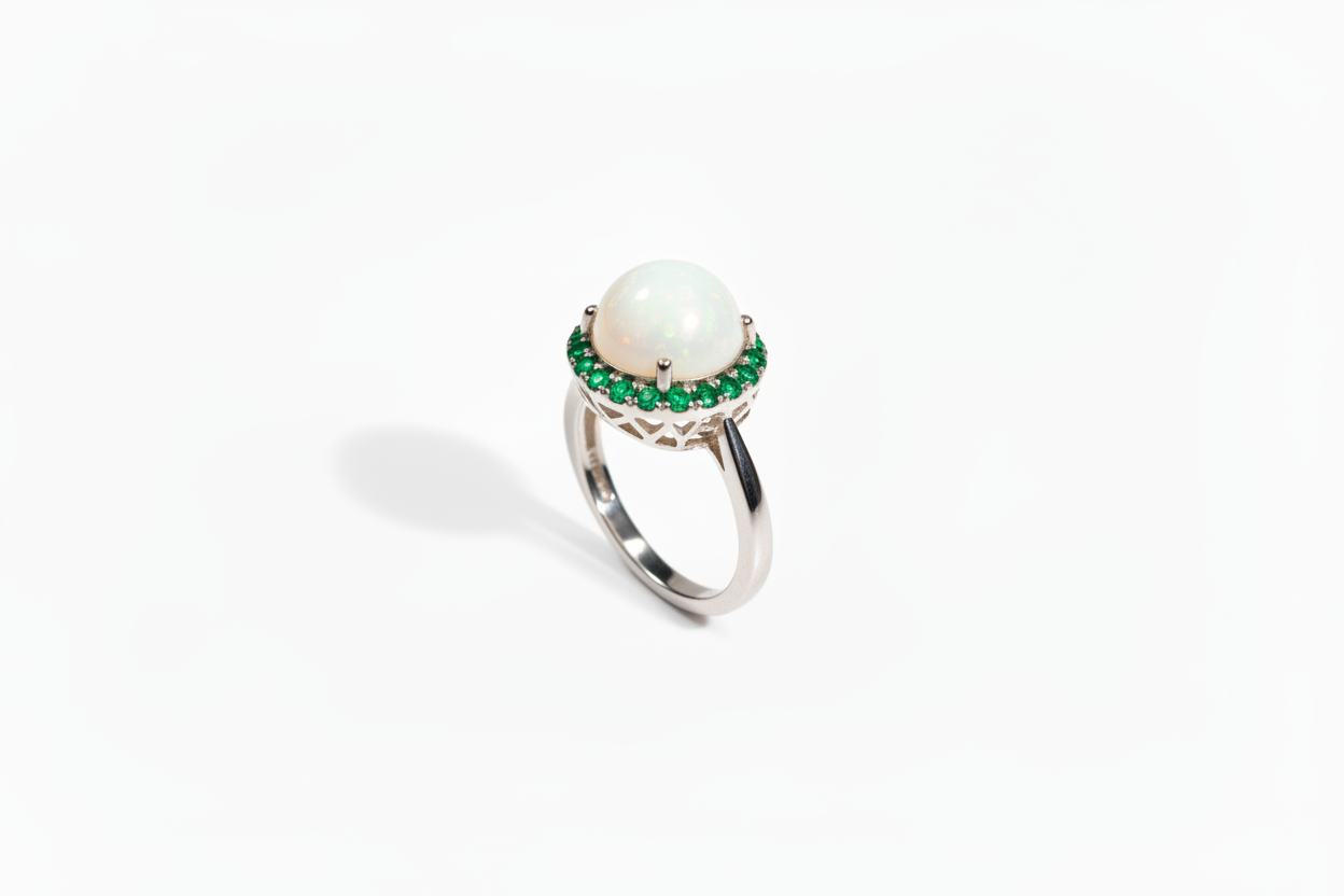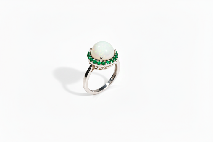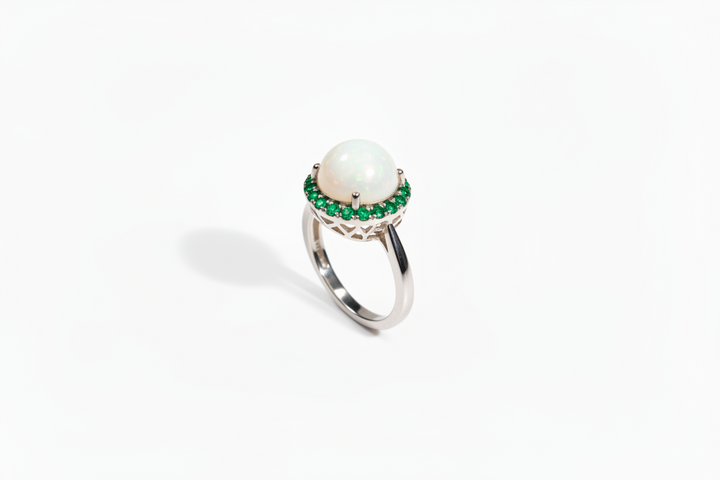 Anello con Pietra di Latte Materno a forma Tonda e Giro di Smeraldi in Oro Bianco 18 Carati