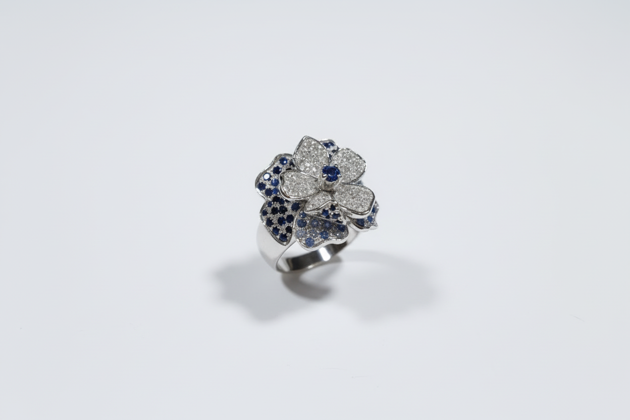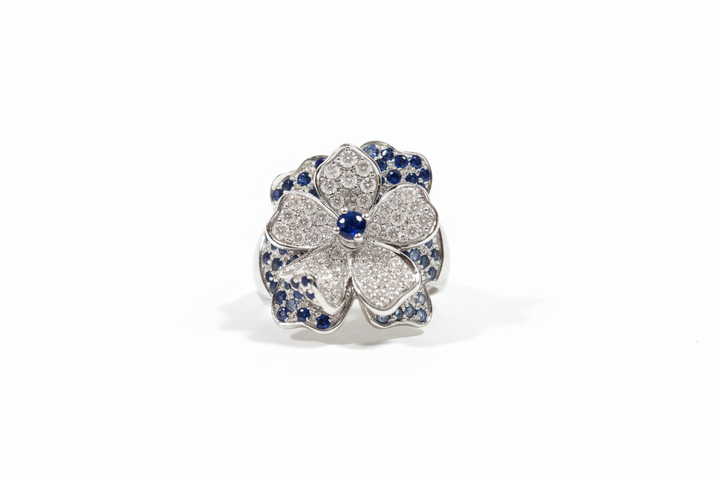 Anello in Oro Bianco con Diamanti e Zaffiri a forma di Fiore