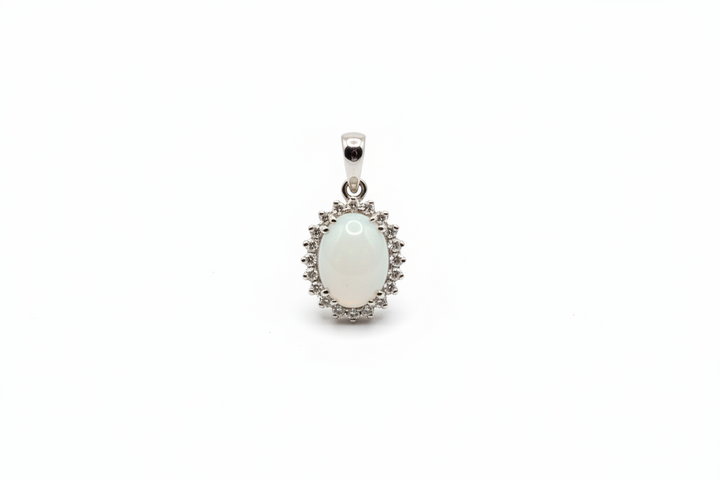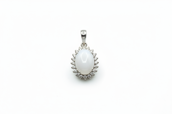 Ciondolo con Pietra di Latte Materno a Forma Ovale in Oro Bianco 18 Kt. e giro di Diamanti