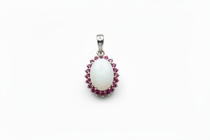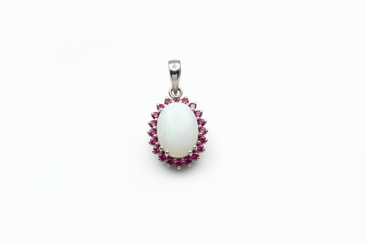 Ciondolo con Pietra di Latte Materno a Forma Ovale in Oro Bianco 18 Kt. e giro di Rubuni
