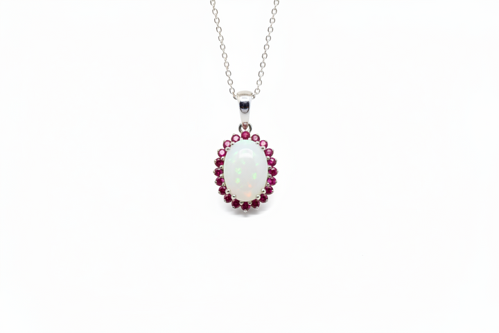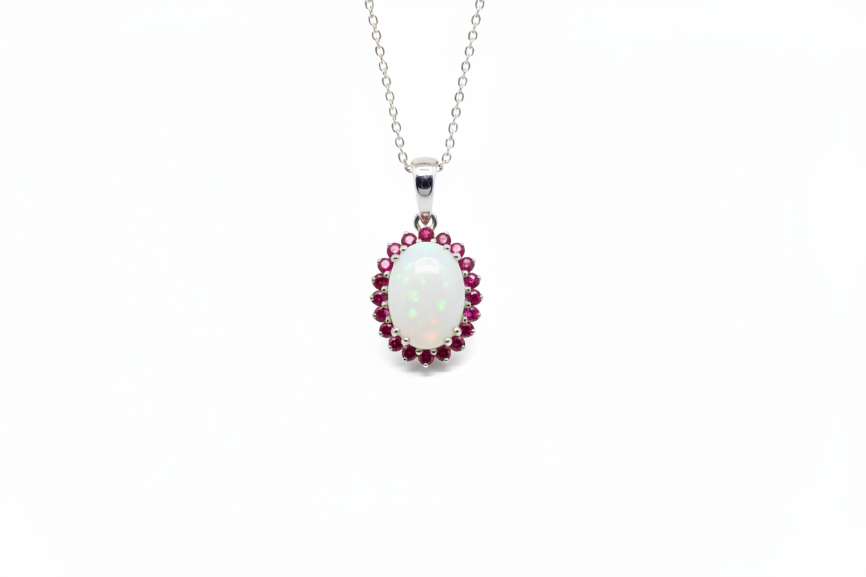 Ciondolo straordinario che trasforma il latte materno in una pietra preziosa a ovaloide, simbolo eterno dell'amore materno. La pietra centrale è circondata da un elegante giro di rubini che ne esaltano la bellezza, il tutto montato su oro bianco 18 carati. Un gioiello unico e significativo che custodisce un ricordo indimenticabile, perfetto per celebrare il legame speciale tra madre e figlio. Un'opera d'arte che unisce sentimento e raffinatezza, da indossare con orgoglio e tenerezza.
