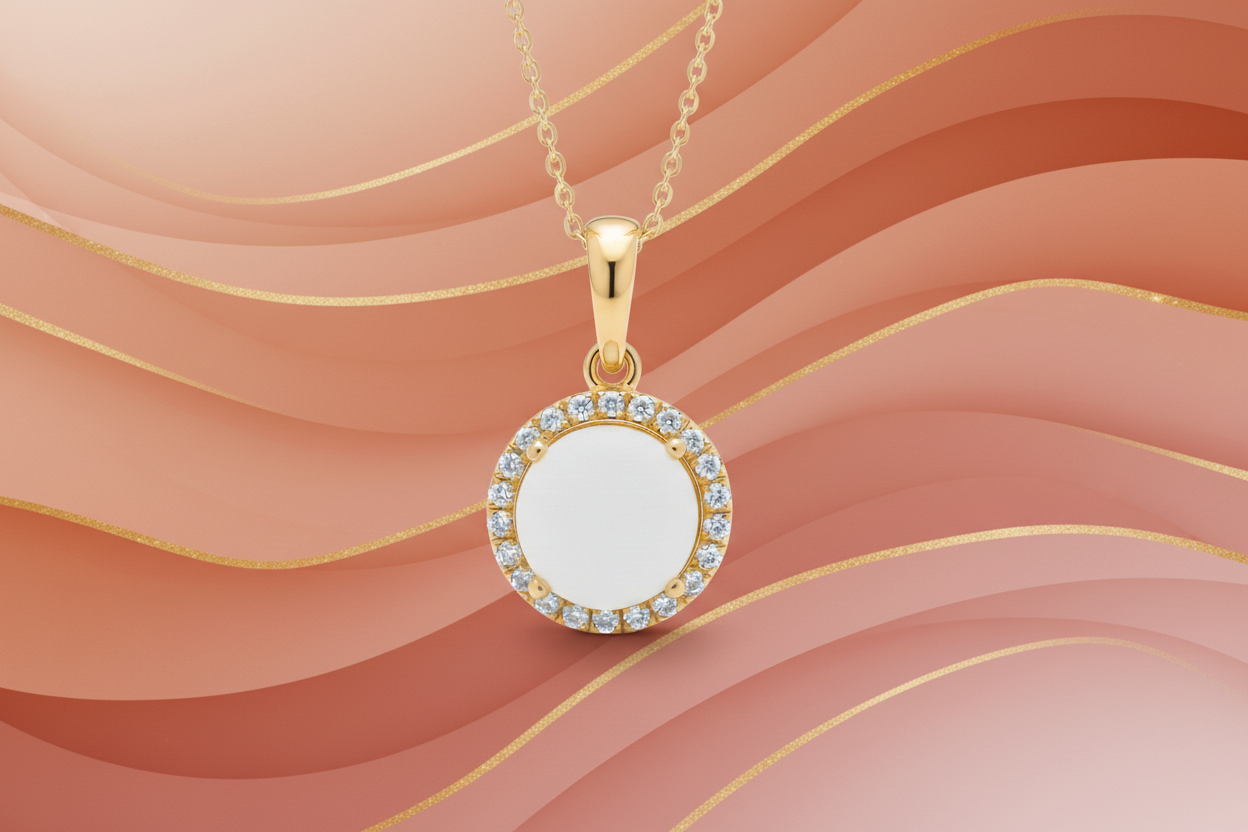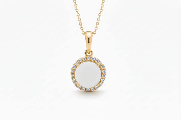 Ciondolo con Pietra di Latte Materno a Forma Tonda in Oro Giallo 18 Kt. e giro di Diamanti