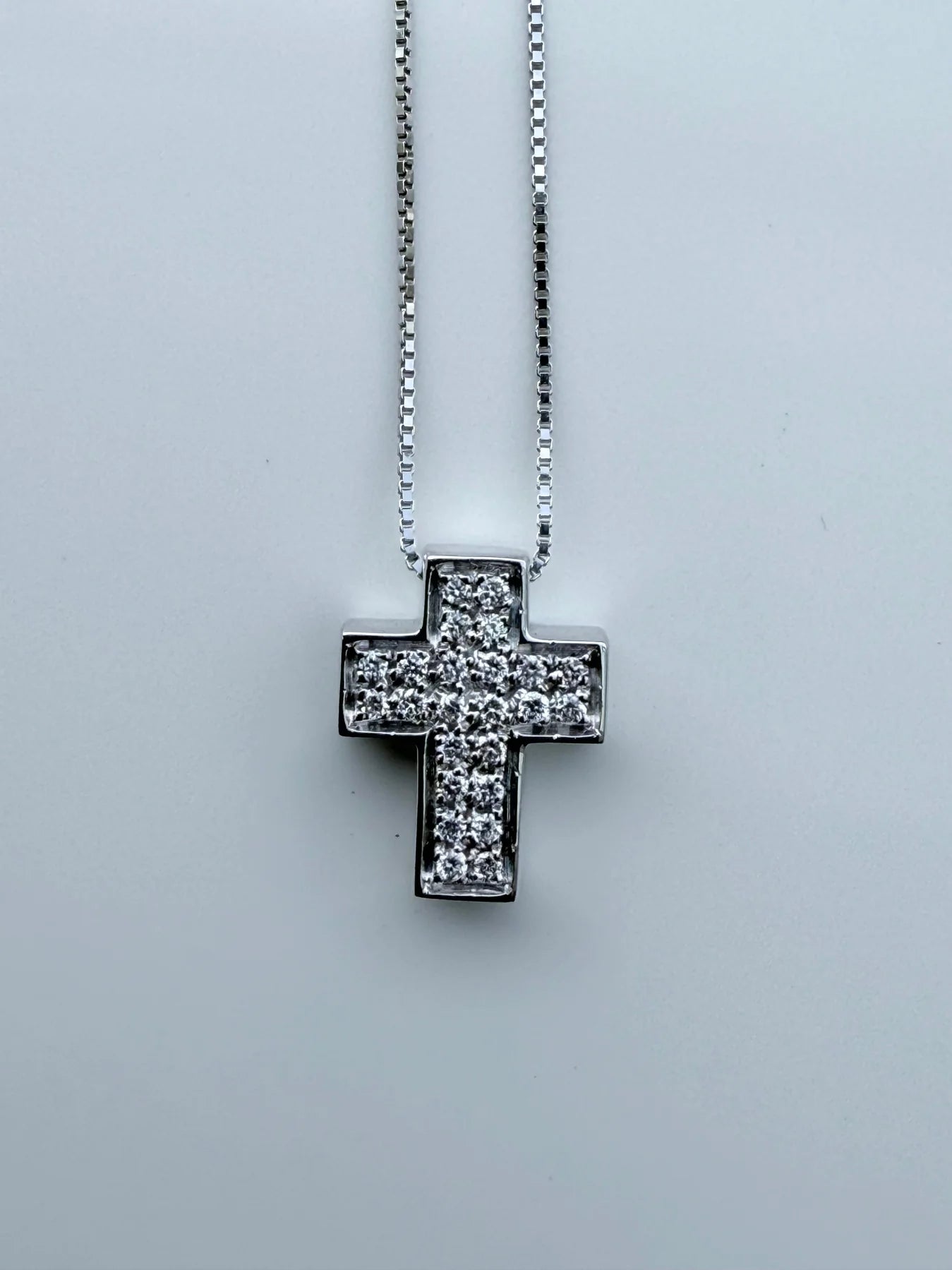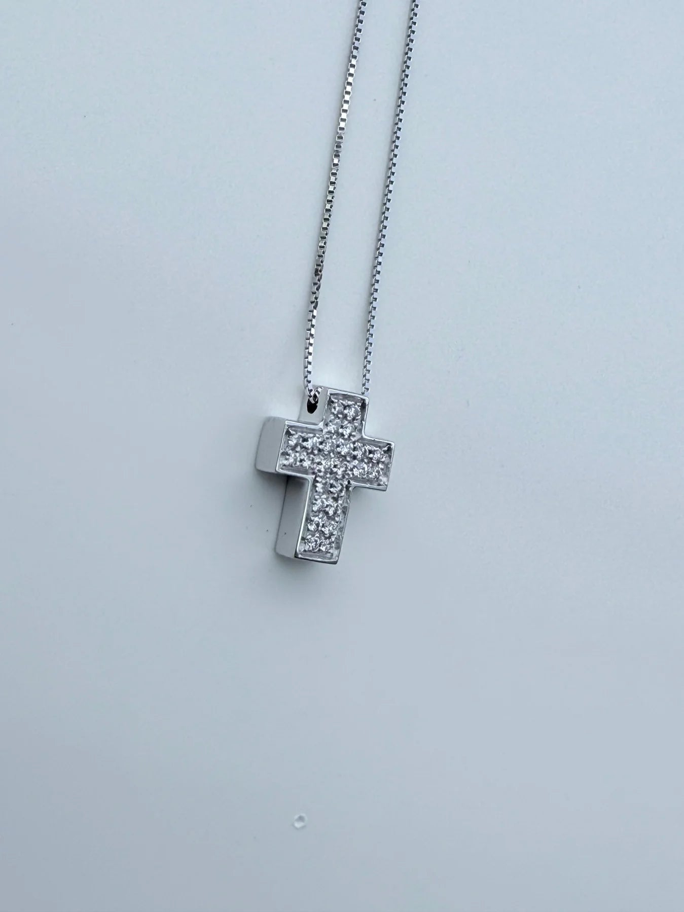 Croce scatolata con catena passante, altezza 1,4 cm, perfetta per aggiungere un tocco elegante e discreto al tuo stile quotidiano.