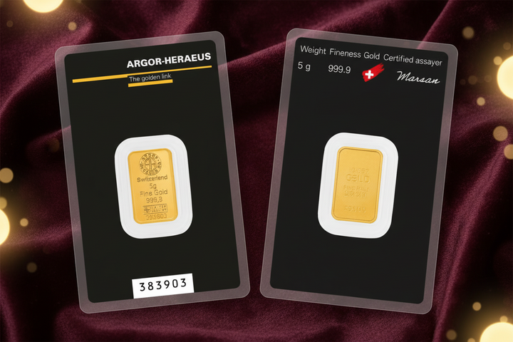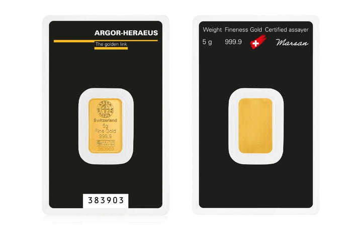 Lingotto d'oro puro da 5 grammi certificato Argor-Heraeus, il massimo standard di qualità nel settore. Realizzato in oro 24 carati (999.9), rappresenta un investimento tangibile e duraturo nel tempo. La purezza garantita e il prestigio del marchio svizzero lo rendono una scelta ideale per chi desidera possedere oro di eccellenza. Perfetto per collezionisti e investitori che cercano solidità e valore autentico.