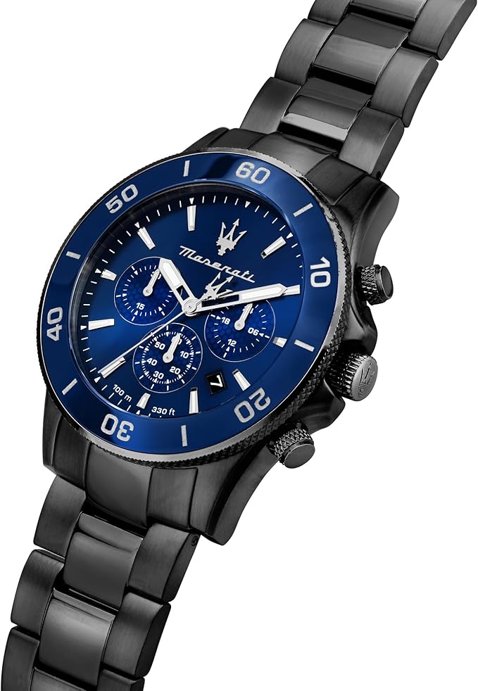 Maserati Orologio da uomo, rif. R8873600005, COMPETIZIONE Collection, in acciaio, movimento al quarzo, cronografo. L'orologio è dotato di un cinturino in acciaio, con fibbia subacquea con pulsanti. La cassa rotonda misura 43 mm, presenta un quadrante blu a raggi di sole e un resistente cristallo di zaffiro. Resistenza all'acqua fino a 10 ATM. Questo orologio viene spedito nella sua scatola di presentazione ufficiale, con 2 anni di garanzia.