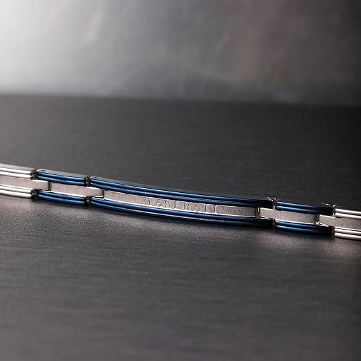 Maserati Bracciale da uomo, Collezione JEWELS, ref. JM121ATK11, in acciaio, pvd blu, lunghezza 22cm. Il gioiello è caratterizzato da una pratica chiusura a clip. Collezione Maserati Jewels: eleganti bracciali e pendenti con dettagli preziosi compongono i gioielli Maserati, dallo stile moderno, con finiture cromatiche che mixano sportività ed eleganza in chiave contemporanea.