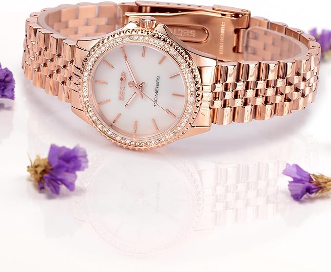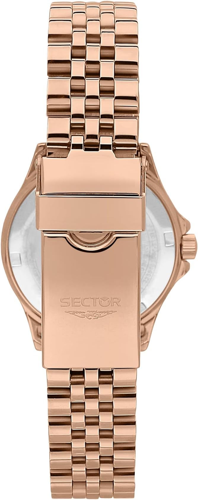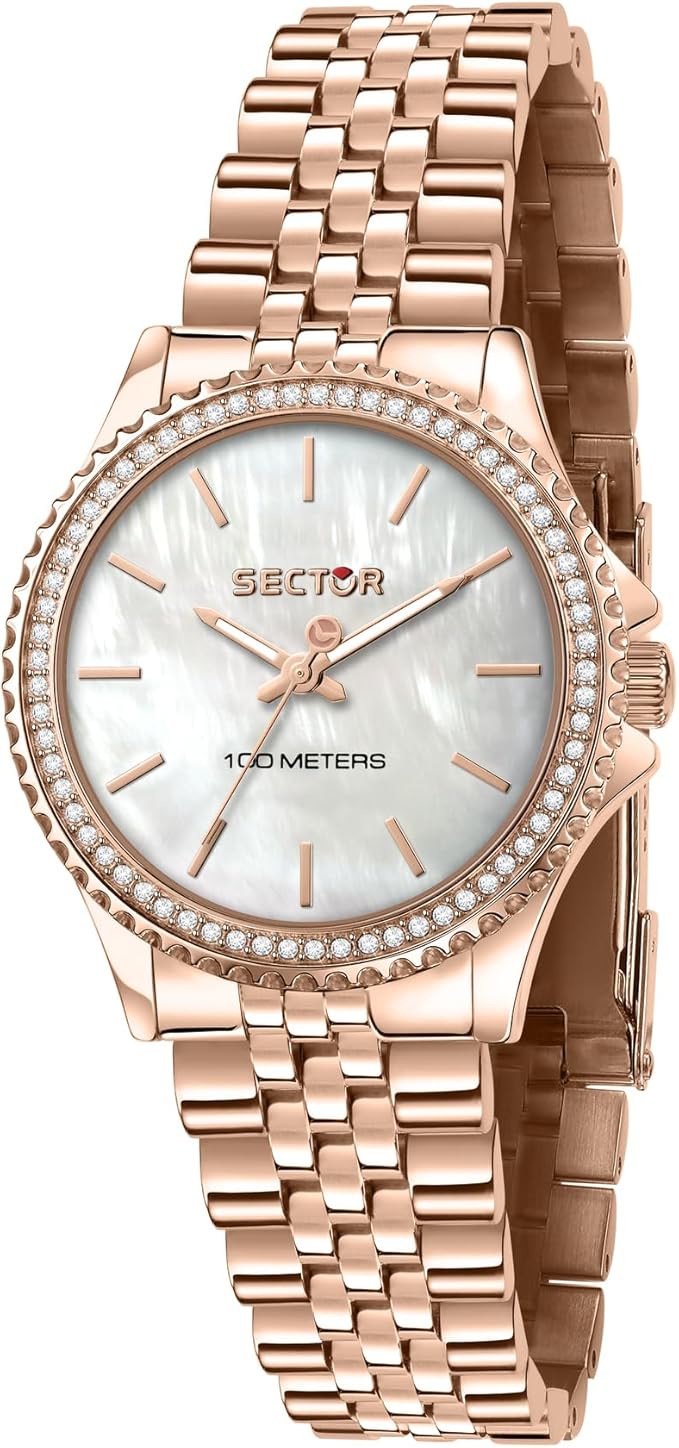 Orologio solo tempo da donna di Sector della collezione 230. Orologio con cassa in acciaio lucido di 32 mm con vetro minerale. Bracciale in metallo di colore oro rosa con chiusura a fibbia diver con blocco sicurezza. Cronografo up e datario a ore 3 e resistenza all'acqua di 10 atm. La referenza è r3253161537